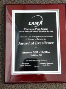 Answer 365 – Halifax of Halifax, NS has been honored with the exclusive 2022 Award of Excellence for 18 years. The Award is presented annually by the Canadian Call Management Association (CAM-X), the industry’s Trade Association for providers of call centre services including telephone answering and message delivery. Answer 365 – Halifax was presented with the Award recently at the CAM-X 58th Annual Convention and Trade Show in Kingston, ON.