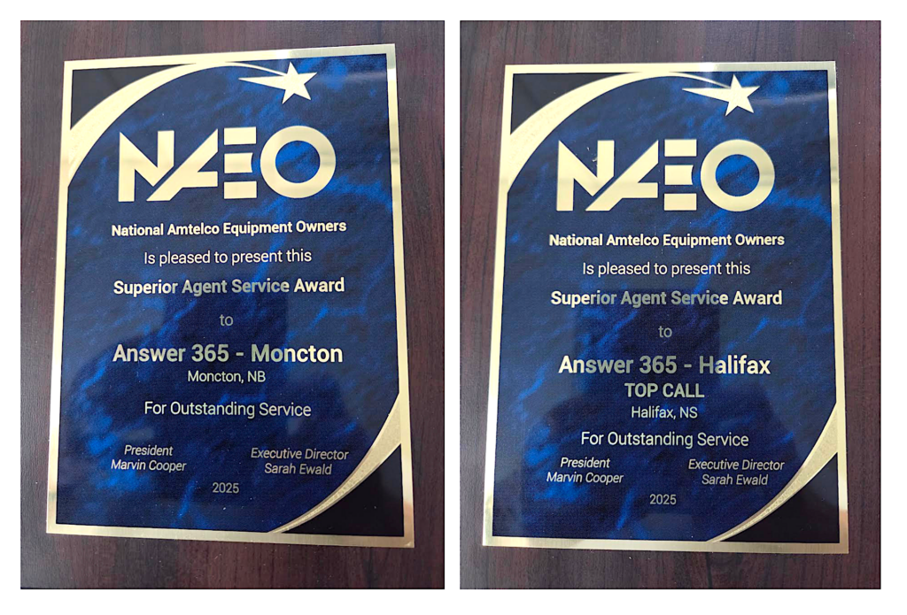 We’re thrilled to share that Answer 365 has been awarded the coveted 2025 Superior Agent Service Award (SASA) and Agent Award of Distinction for Overall Top Call by the National Amtelco Equipment Owners (NAEO).
